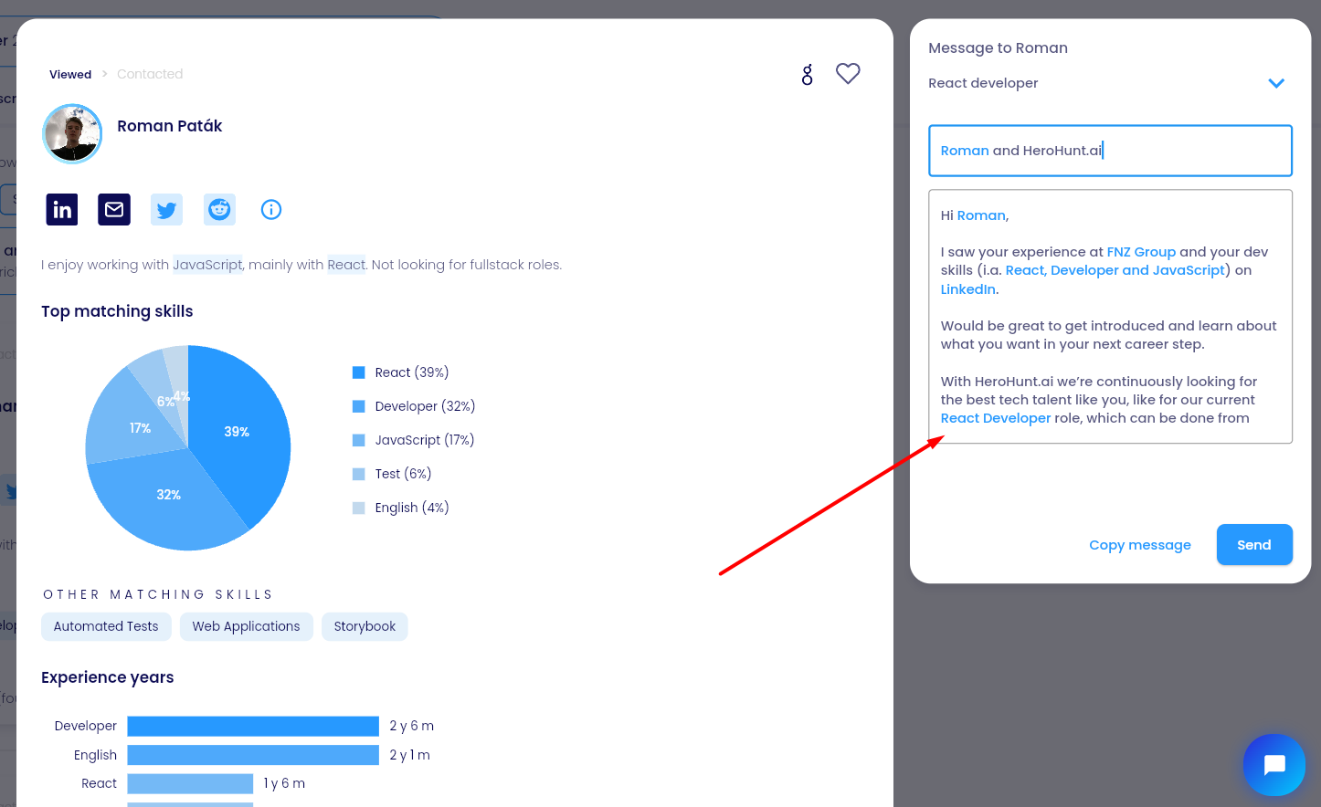 For this example we use HeroHunt.ai to create your personalized outreach message.