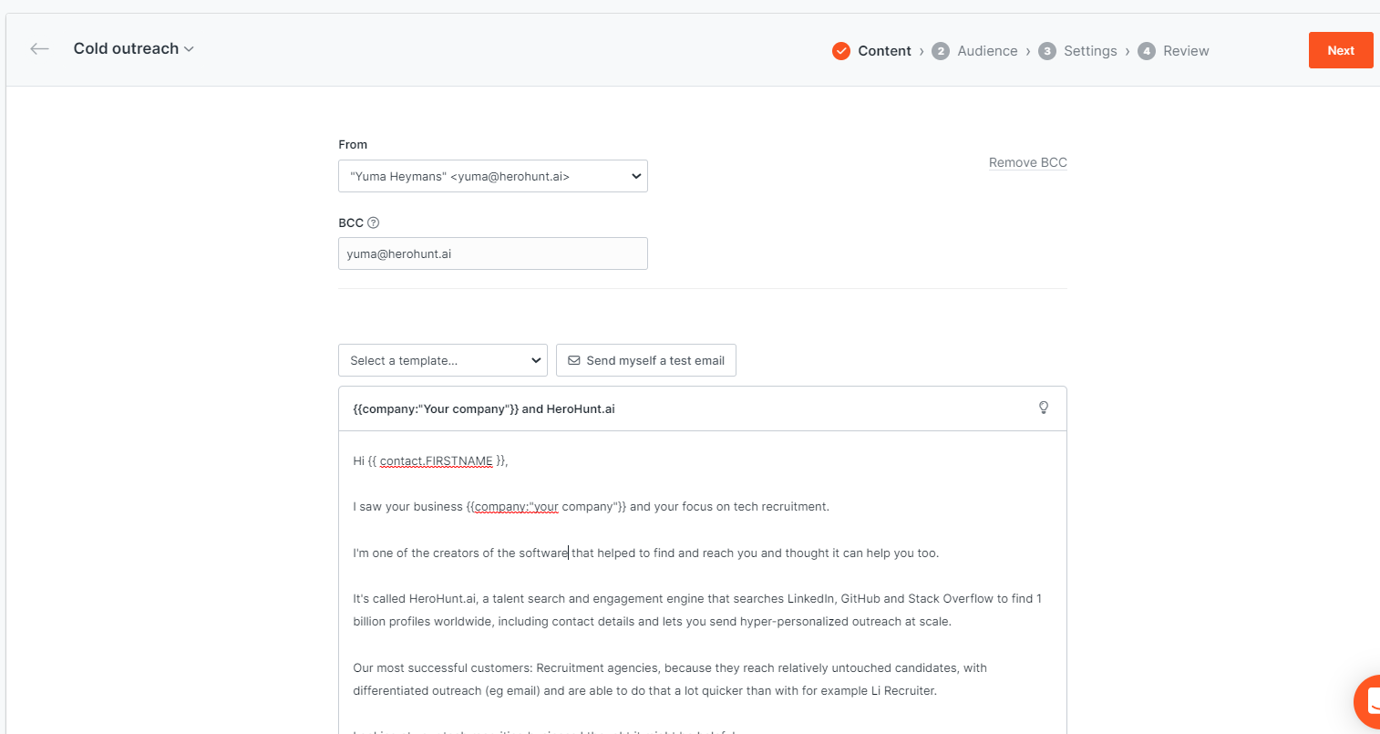 With a tool like Hunter, you can set up a sequence of for example 3 emails which will be sent after each other with a certain amount of days in between. The software keeps track of if candidates haven't already replied. You can personalize the individual messages in the sequence using the data of the candidate (for example first name, location and current job title). By uploading your target list with profiles from step 1 including the enriched emails from step 2, you’ll be able to send a set of emails to the candidates over a period of time.