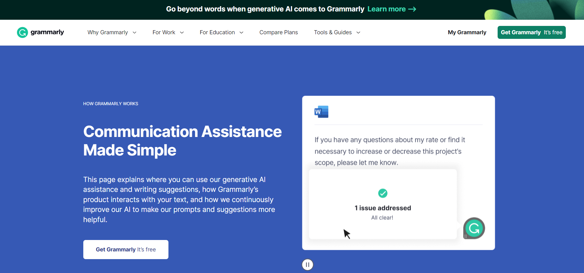 Grammarly is an online writing assistant that integrates with popular tools like Microsoft Word, Google Docs, and Slack and uses AI to detect and correct grammar, spelling, and punctuation errors in your writing. It also checks for clarity, conciseness, and tone to ensure that your message is conveyed in the most effective way possible.