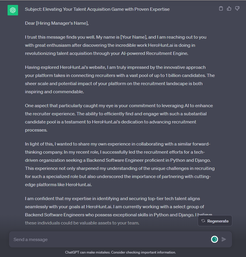 ChatGPT can assist recruiters in crafting personalized and engaging outreach emails to potential hiring managers. Recruiters can input details about their role and company culture, and use prompts like: