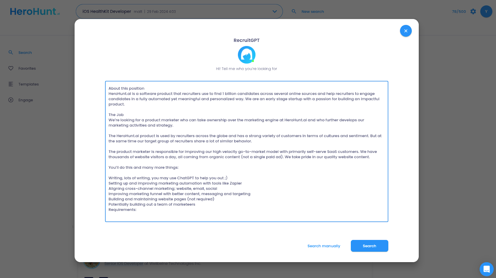 With Greenhouse connected to HeroHunt.ai, you can now find and synchronize new candidate profiles from HeroHunt.ai to Greenhouse. For instance, if you're hiring for a Marketing Manager, input your job description into HeroHunt.ai to discover the best fits.