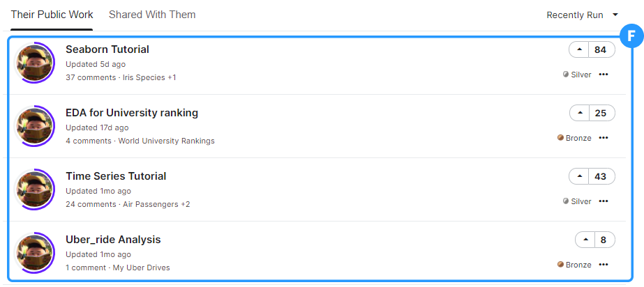 Kagglers can earn points by winning competitions, publishing datasets and notebooks, and adding value in discussions. Based on the points that users earn a ranking is assigned. You can search in the Kaggle user rankings to find the best data scientists:
