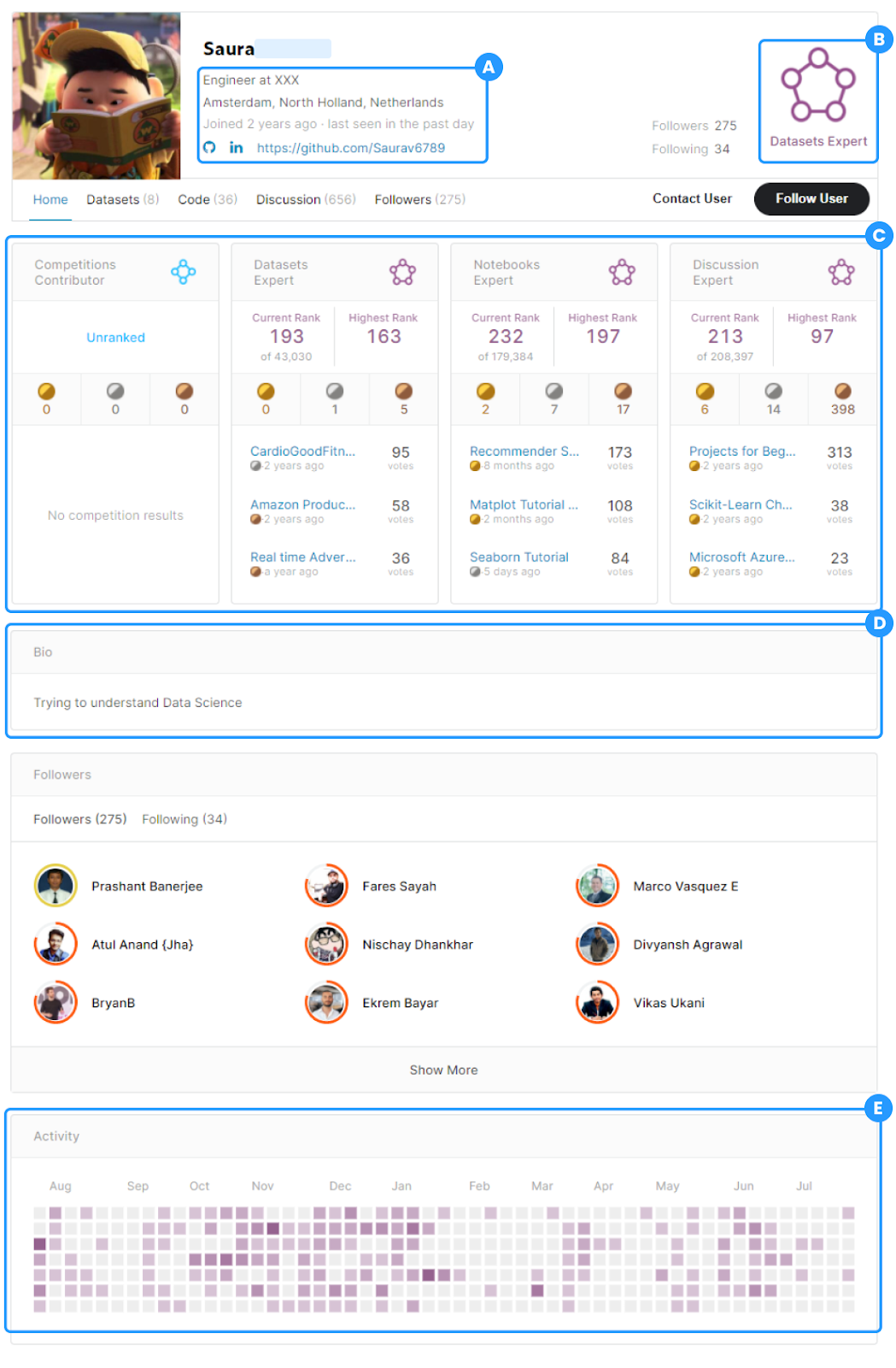 C: Rank based on points and awards for competitions, datasets, notebooks and discussions
