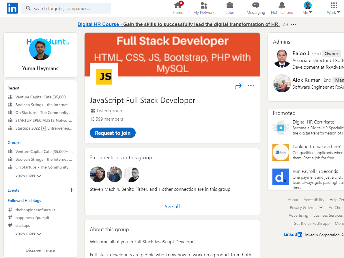 Some examples of LinkedIn groups are the ‘Venture Capital Cafe’ group and the ‘JavaScript Full Stack Developer’ group.