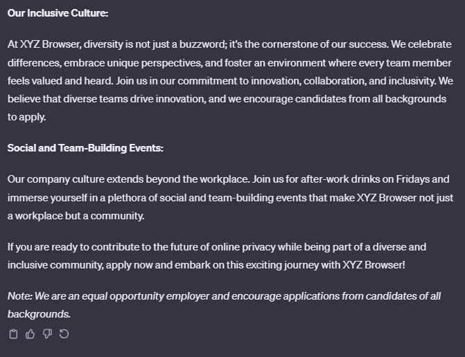 46% of candidates in the United States consider company culture as a deciding factor in taking a new job, so be sure to include more than just the salary and compensation. Infuse the job description with elements of your company culture and values as well. Ask ChatGPT to articulate these aspects to make the description more appealing to potential candidates.