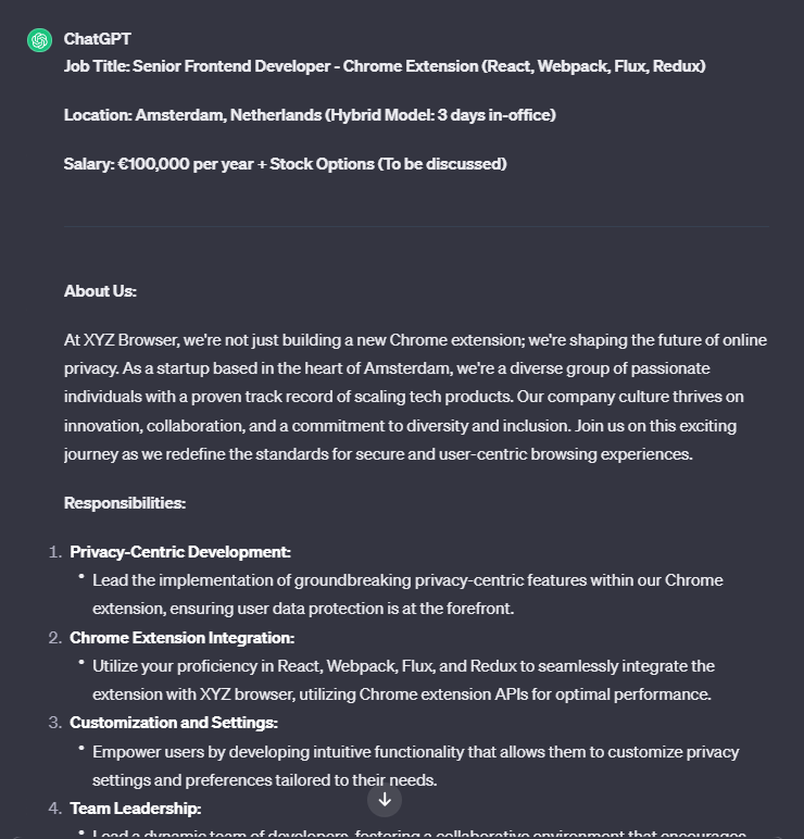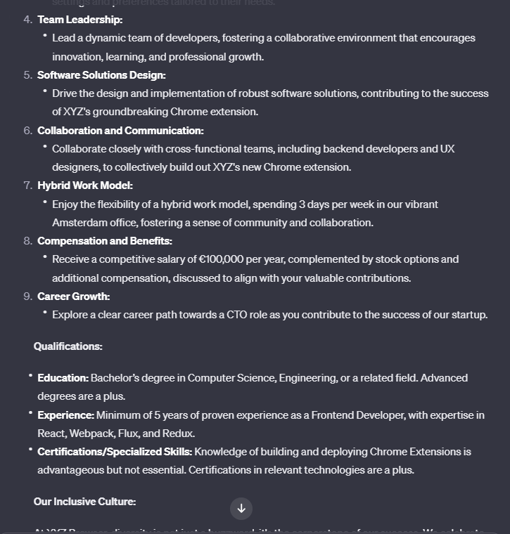 If you have a really good job description for a role, you can copy and paste it into ChatGPT and prompt something like “Here is a well-done job description that’s for a Frontend Developer. It is formatted perfectly, please give me the same as above except for a Backend Engineer”