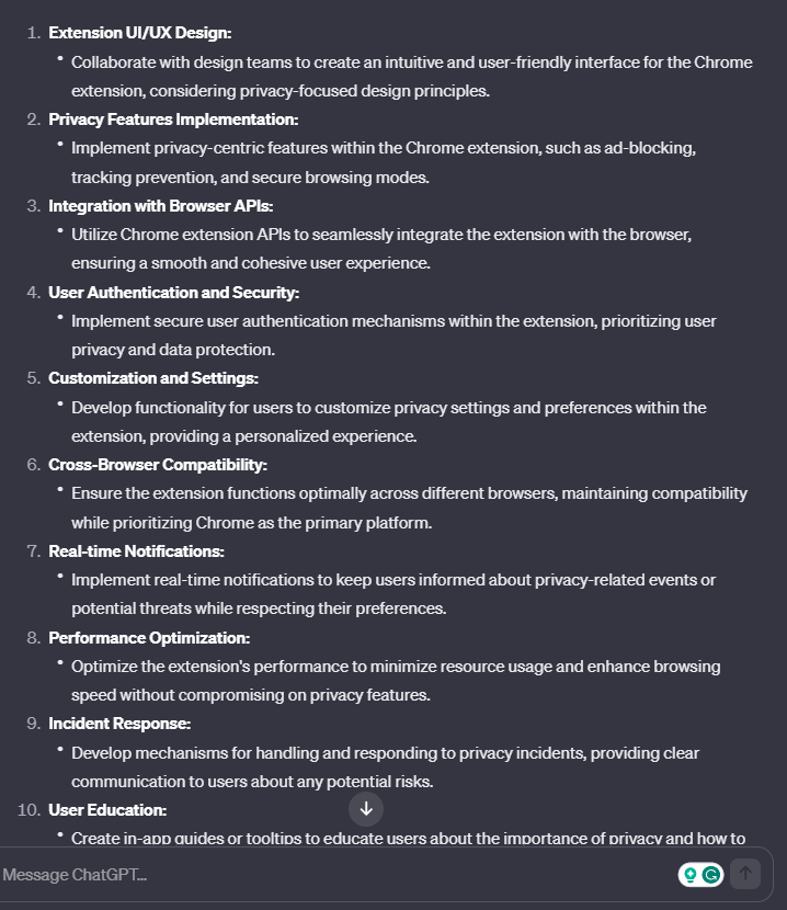 Start a new thread, and prompt: What would some key responsibilities be for a frontend developer if they were to work at a privacy web browser company and are in charge of creating the new Chrome extension product?