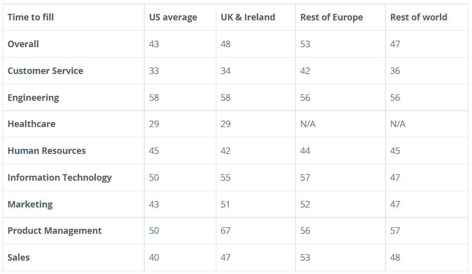 The average time to fill varies significantly per industry as illustrated in the below table.