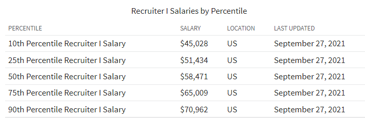 - According to Salary.com the average salary for Recruiter in 2021 in the US is $58,471.