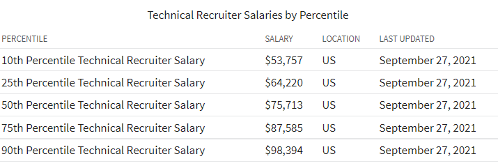 - According to Salary.com the average salary for Technical Recruiter in 2021 in the United States is $75,713.