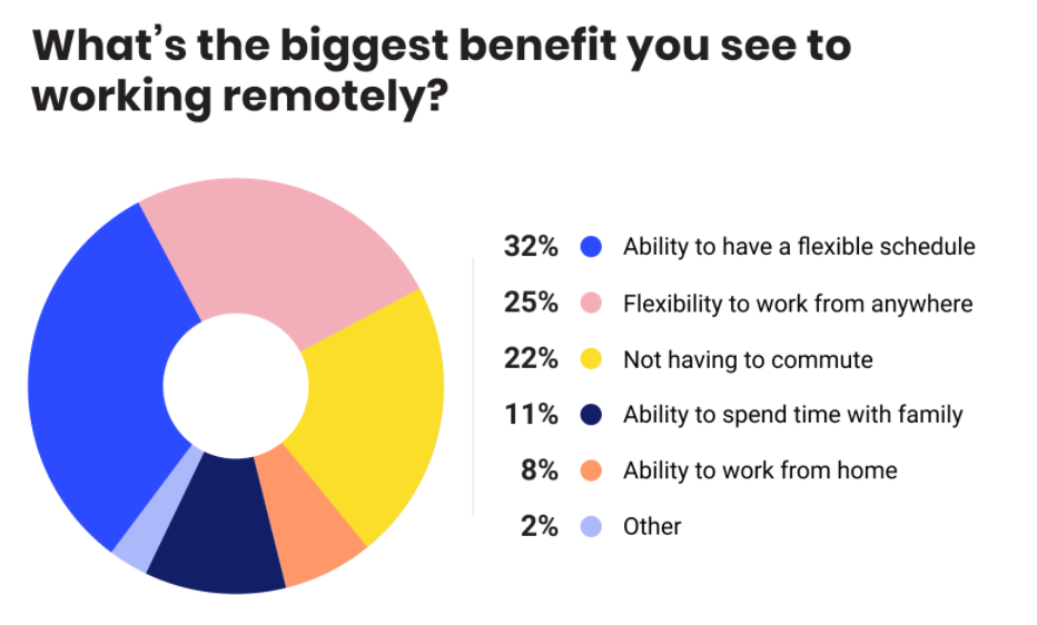 Remote workers are reaping the benefits of remote with flexibility, work from anywhere, no travel time and family time mentioned as the biggest benefits.