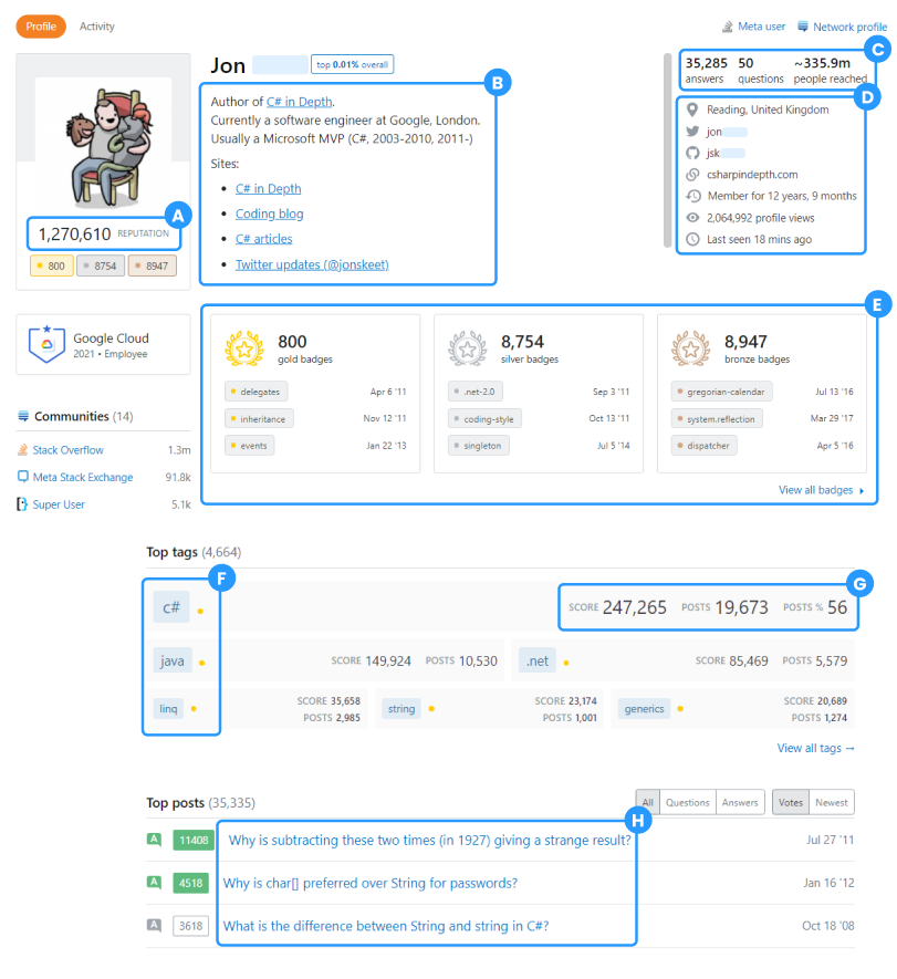 Information about the engineer is usually very much up to date because the engineers ask and answer questions based on the technologies they are using at that moment. Stack Overflow identifies the top technologies an engineer uses based on their activity, similar to GitHub (technology tags, reputation, badges and scores).
