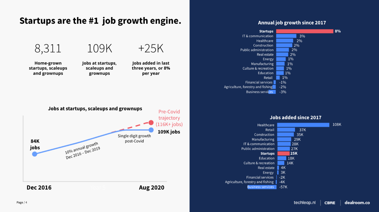 Dutch startups are the #1 job growth engine in the Netherlands according to research from Techleap, Dealroom, CBRE reported in October 2020. Dutch startups account for 109k jobs, 25k of which were created in the last three years. This comes down to more than 8k jobs per year. The growth of startup jobs has shown an average of +8% annual growth.